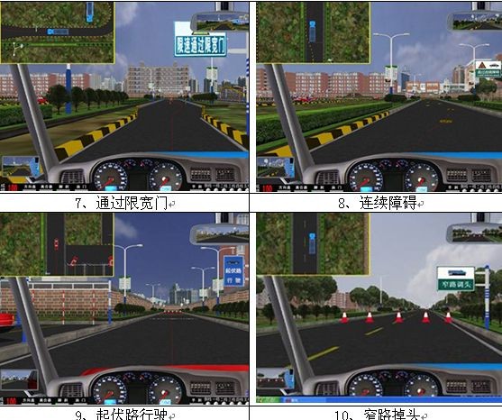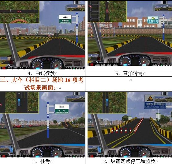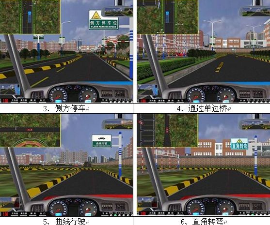 小車(科目二)場地 5 項分別為:倒車入庫、坡道定點停車和起步、側方停車、曲線行駛、直角轉彎;大車(科目二)場地 16 項分別為:樁考、坡道定點停車和起步、側方停車、通過單邊橋、曲線行駛、直角轉彎、通過限寬門、通過連續障礙、起伏路行駛、窄路掉頭、模擬高速公路、連續急彎山區路、隧道、雨天、霧天濕滑路、緊急情況處置。新版汽車駕駛模擬器軟件道路駕駛技能考試(科目三)內容包括:上車準備(系安全帶)、起步、直線行駛、加減擋位操作、變更車道、靠邊停車、直行通過路口、路口左轉彎、路口右轉彎、通過人行橫道線、通過學校區域、通過公共汽車站、會車、超車、掉頭、夜間行駛等訓練考試項目。