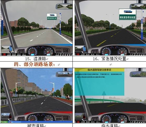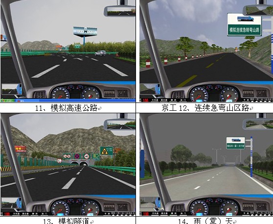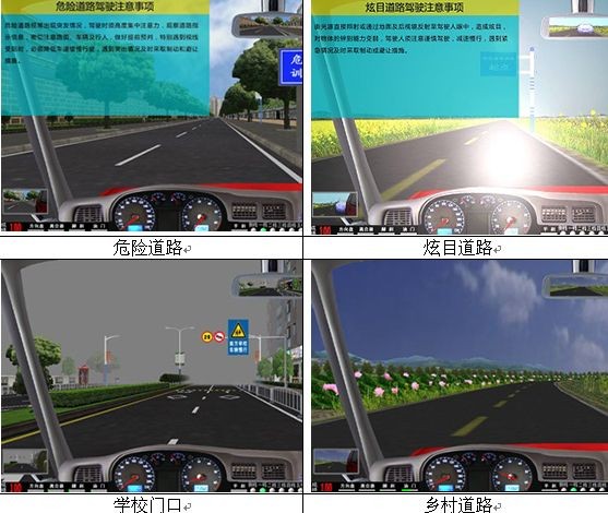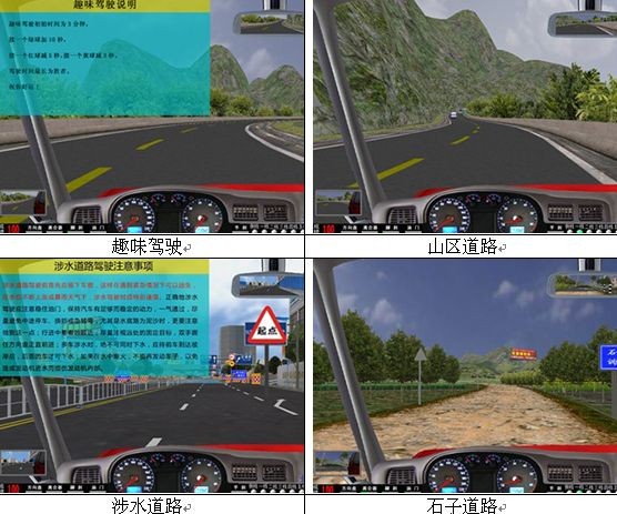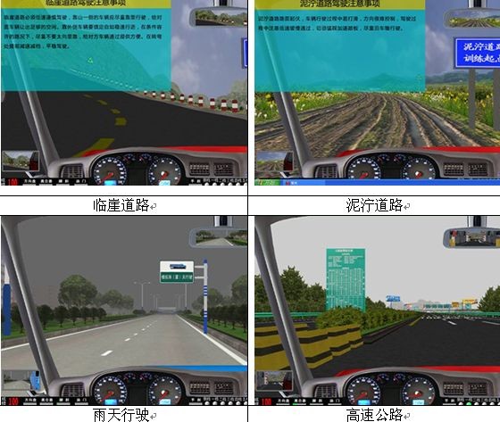 炫目道路: (朝九晚五的太陽)炫目會車,炫目駕駛鄉村道路等 。泥濘道路: 泥濘洼地道路駕駛 ( 方向、制動、驅動有打滑滯后感 ) 場景模型取鄉村道路,道路變為泥濘狀態。 石子路面: 汽車在其上面行駛,遇到剎車時剎不住車,還可汽車還在繼續滑動,有時還會斜向滑行,極難控制感,汽車在石子路面里滑動。 涉水道路 : 涉水駕駛汽車有水流沖力對車輛的前進阻力感光及側滑感,輪胎與水下的路壓力減小,驅動力受到限制,使行駛受阻感覺。 專項訓練: 要附合交通部要求。 系統評分:每次駕駛結束 , 系統自動評分。 山區到路: 突出坡多、彎多、凹凸路面、駕駛環境復雜、有側風、有陡坡長坡、溜坡、側滑(有語音提示)。 鄉村道路: 含鐵道路口;加油站,公交車站、單行道、農田道口等; 城市道路: 含公交站臺,高架立交橋、公交專用道、十字路口、丁字路口、環島、隧道、單行道、雙黃線、加油站、商場百貨門口斑馬線天橋,學校門口及紅綠燈,行人、非機動車亂穿馬路及非機動車等。 高速公路: 包括收費站(入、停、出、)服務區、緊急帶、匝道行駛、超車道、行車道、隧道、立交橋、交通標牌標線。 危險場景: 視線不清的交通情況下,超車后突然切入他人道引起被超車輛緊急制動、自行車、行人突然橫穿馬路,路面維修,障礙物繞行等 危險場景、 |