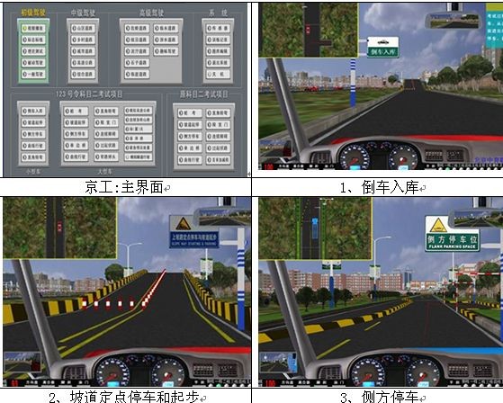 軟件功能: 小車(科目二)場地 5 項分別為:倒車入庫、坡道定點停車和起步、側方停車、曲線行駛、直角轉彎;大車(科目二)場地 16 項分別為:樁考、坡道定點停車和起步、側方停車、通過單邊橋、曲線行駛、直角轉彎、通過限寬門、通過連續障礙、起伏路行駛、窄路掉頭、模擬高速公路、連續急彎山區路、隧道、雨天、霧天濕滑路、緊急情況處置。新版汽車駕駛模擬器軟件道路駕駛技能考試(科目三)內容包括:上車準備(系安全帶)、起步、直線行駛、加減擋位操作、變更車道、靠邊停車、直行通過路口、路口左轉彎、路口右轉彎、通過人行橫道線、通過學校區域、通過公共汽車站、會車、超車、掉頭、夜間行駛等訓練考試項目。