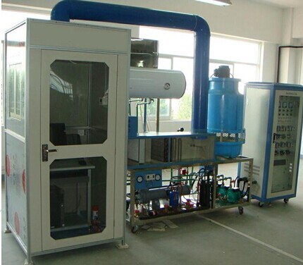 由壓縮機、 螺旋式 冷凝器、 螺旋式 蒸發器、 儲液罐、熱力膨脹閥、視液鏡、干燥過濾器等 組成 ,管路中還設有控制閥等實訓所必需的部件,管路中視液鏡可觀察制冷劑狀態等設備組成。制冷機組主要完成制冷工作,制冷劑為 R22 。